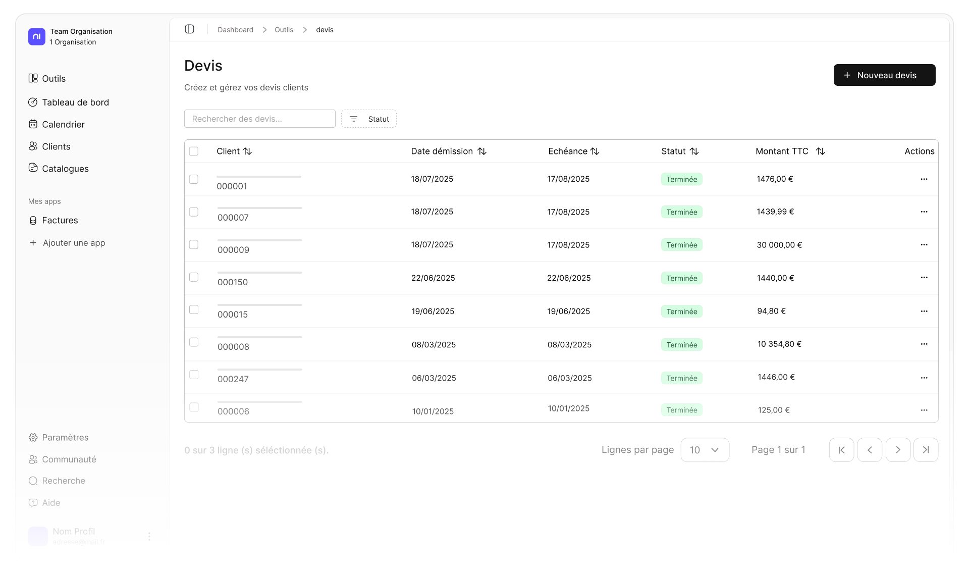 Parallèlement, la gestion commerciale est boostée par l’outil de Devis, conçu pour transformer les propositions en contrats effectifs. Les utilisateurs peuvent élaborer des devis détaillés et professionnels pour impressionner leurs clients. La création est ultra-rapide, nécessitant seulement le remplissage des informations clés et la sélection des produits pour que le devis soit prêt à être envoyé en quelques secondes.