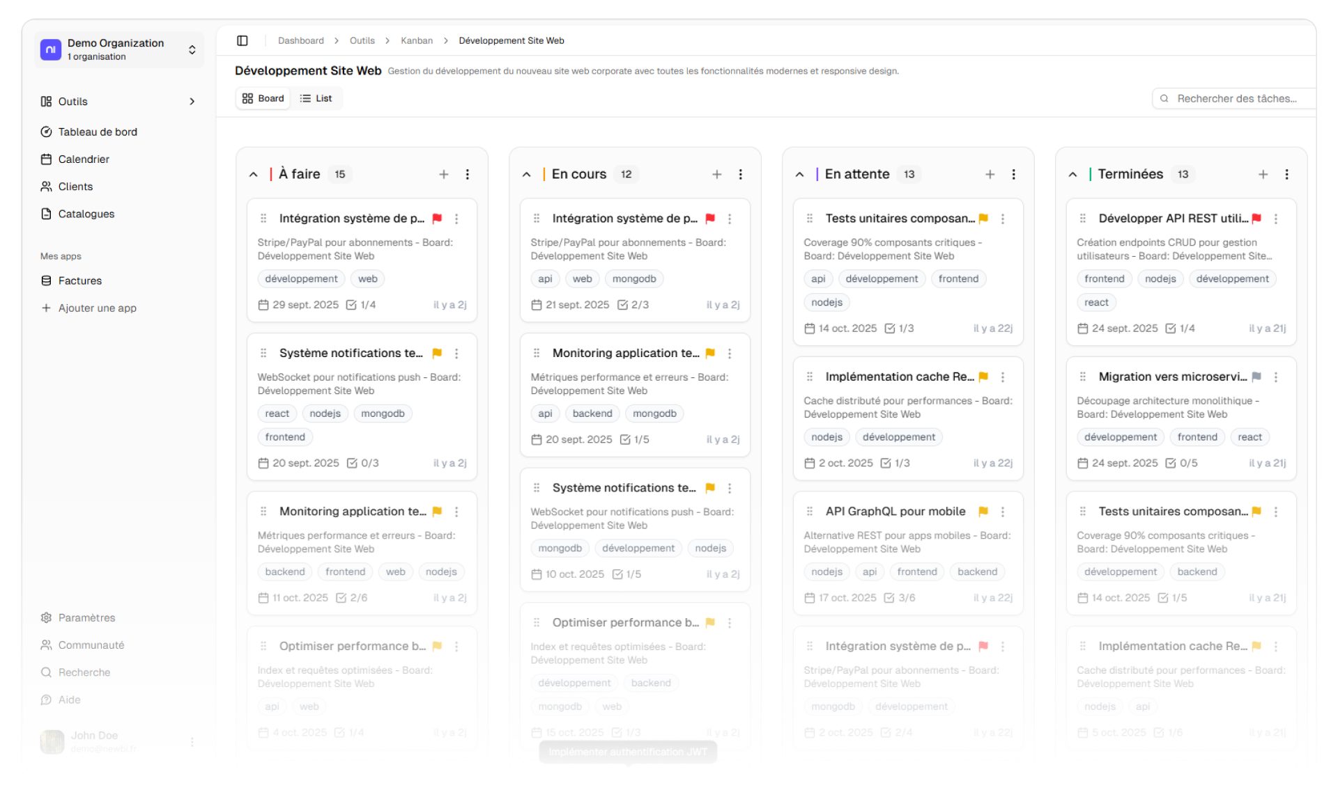 Pour l’organisation interne et la gestion de projet, Newbi propose un Tableau Kanban. Cet outil est conçu pour structurer l’organisation, gérer les tâches et les équipes avec simplicité. L’interface se veut d’une « simplicité radicale » : il suffit de glisser et déposer les cartes pour changer de colonne, se concentrant sur l’essentiel.